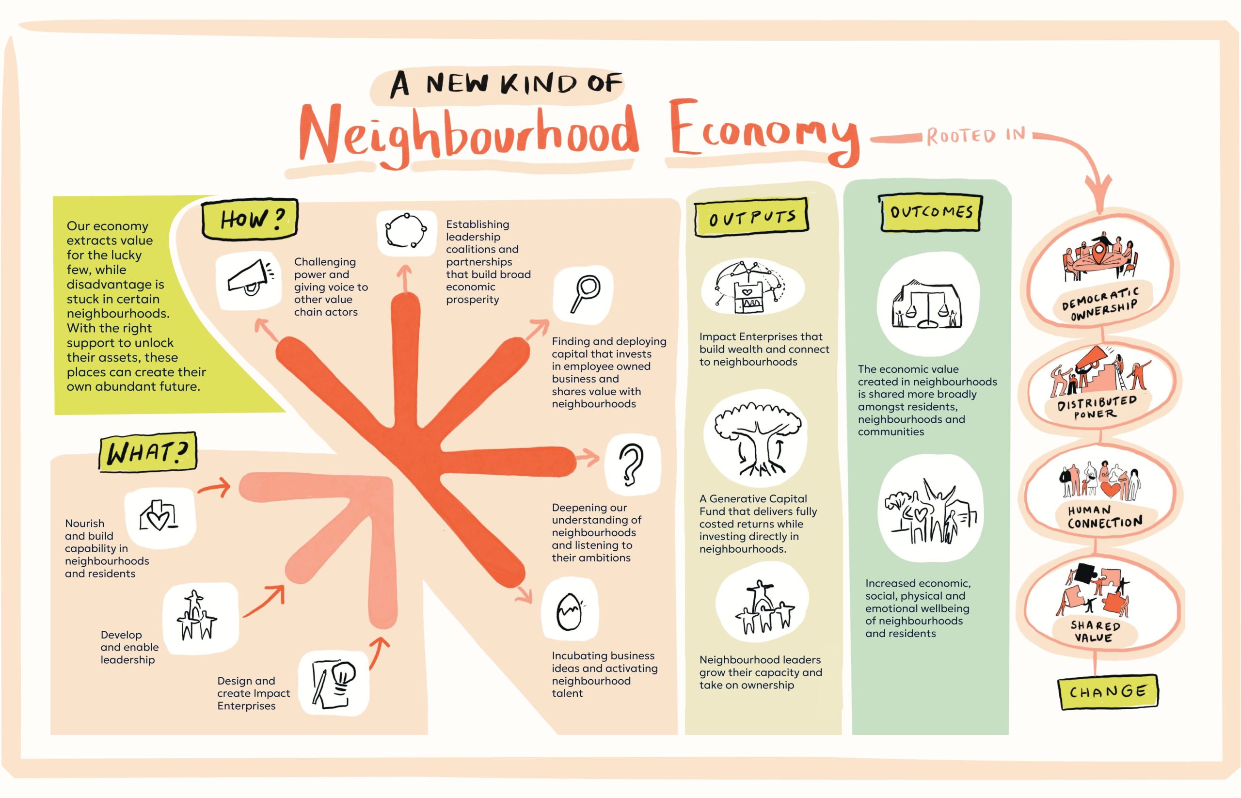 It starts with understanding the challenge and imagining what a stronger, fairer local economy could look like. Our Theory of Change outlines how change can take root and grow over time, guided by practice, evidence, and learning. This is our current view of the pathways that can help communities build more resilient, generative, and equitable neighbourhood economies.